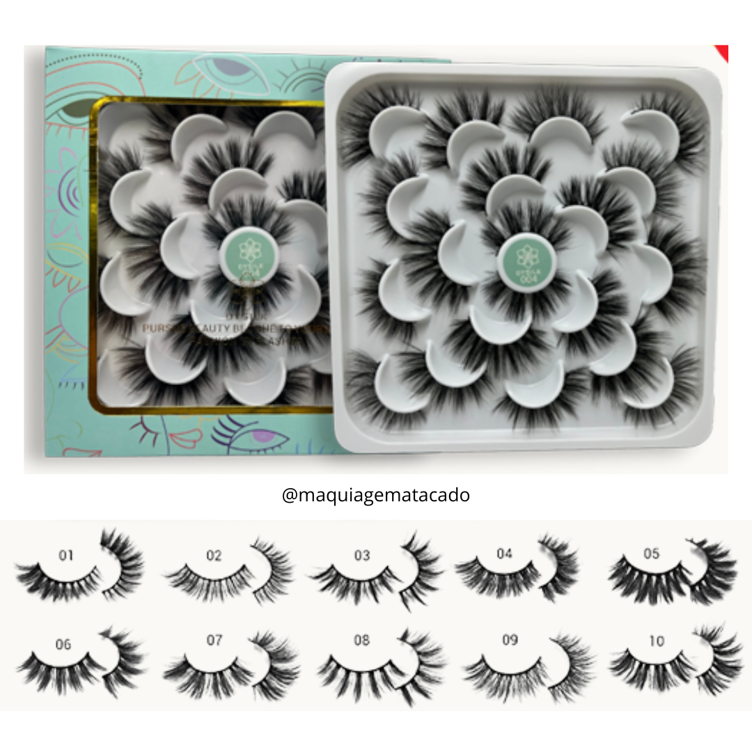 Cartela com 10 pares, com 10 modelos de cílios postiços.