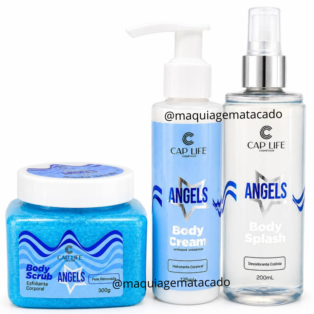 Kit Angels Cap Life 01 Body Scrub Esfoliante Corporal, 01 Body Cream Hidratante Corporal e 01 Body Splash