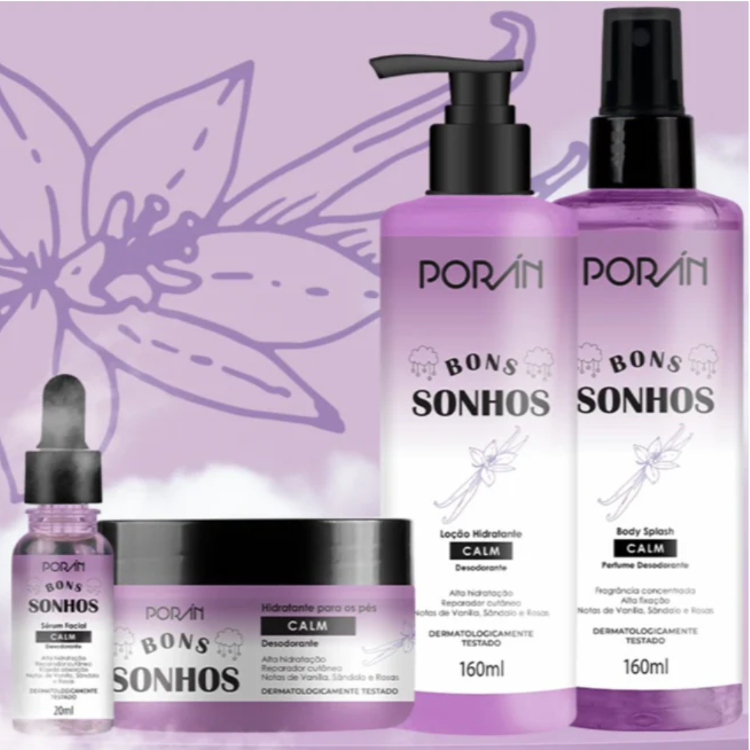 01 Body Splash Bons Sonhos Porán Calm PR321 (160ml), 01 Hidratante Para os Pés Bons Sonhos Porán Calm PR323 (150g), 01 Loção Hidratante Bons Sonhos Porán Calm PR320 (160ml) e 01 Sérum Facial Bons Sonhos Porán Calm PR322 (20ml).